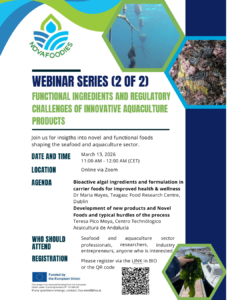 NOVAFOODIES is pleased to announce a two‑part webinar series dedicated to the future of novel and functional foods in the seafood and aquaculture sector. Organised within the framework of the EU‑co‑funded NOVAFOODIES project, the event will gather researchers, industry actors, innovators, and all stakeholders interested in new food sources and sustainable marine‑based ingredients. The webinars offer a unique opportunity to explore scientific insights, market perspectives, technological advances, and the regulatory environment surrounding algae‑based products and Novel Foods. Participation is free of charge and open to professionals and the wider public.